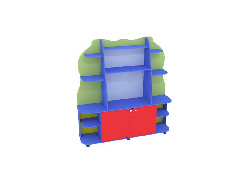 Симетричный уголок с волнистыми линиями, закругленными углами полок и столешницы. На нижних открытых полках можно расположить демонстрационные материалы, игрушки, прочий инвентарь, а на верхних - цветы. На столешнице могут стоять аквариум с рыбками или клетка с попугаем. Закрытая тумба позволит хранить без всеобщего доступа необходимые материалы или корм для животных.