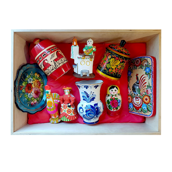Все изделия, вложенные в сундучок, изготовлены и расписаны вручную.