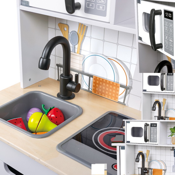 На кухне можно "помыть" в мойке под краном продукты, фрукты и овощи, приготовить на плите или в духовом шкафу, а подогреть в микроволновой печке. Кухня со светом и звуком, ручки крутятся, есть раковина и настоящий смеситель, все очень реалистично!