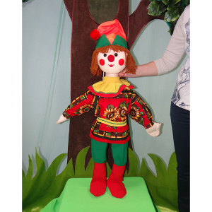 Мягконабивная кукла «Петрушка» практически соразмерна росту ребенка. Дети могут управлять ее действиями, поскольку кукла имеет на ногах, руках и голове специальные элементы для фиксации к телу кукловода.