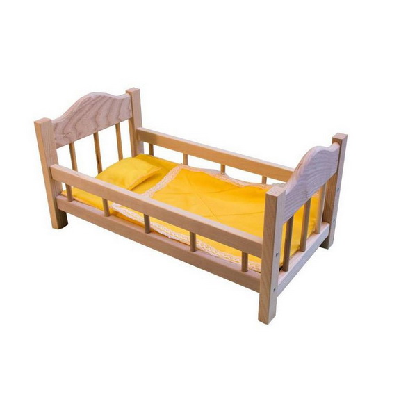 Очень удобная кроватка для кукол. Изготовлена полностью из дерева, постельное белье-текстиль. Подойдет для небольшого пупса.
